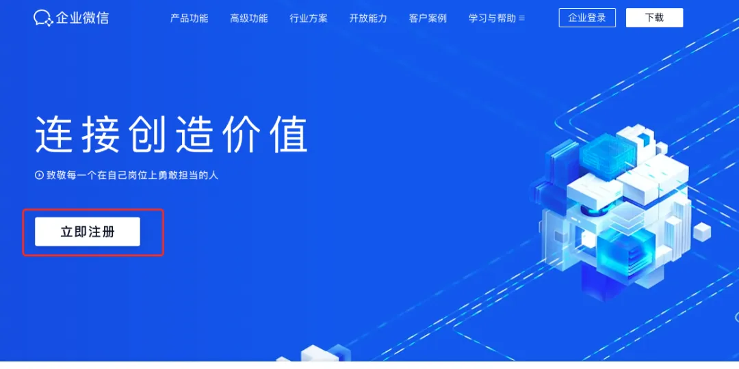 访问官网 https://work.weixin.qq.com/,点击【立即注册】开始注册。