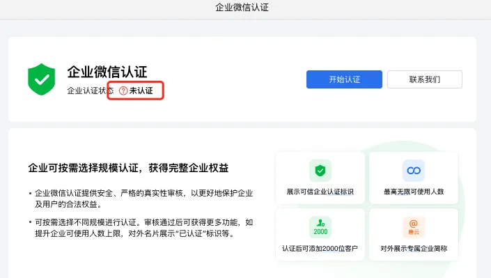 新注册的企业微信主体都处于“未认证”状态,此时企业微信的功能和规模会受到限制。