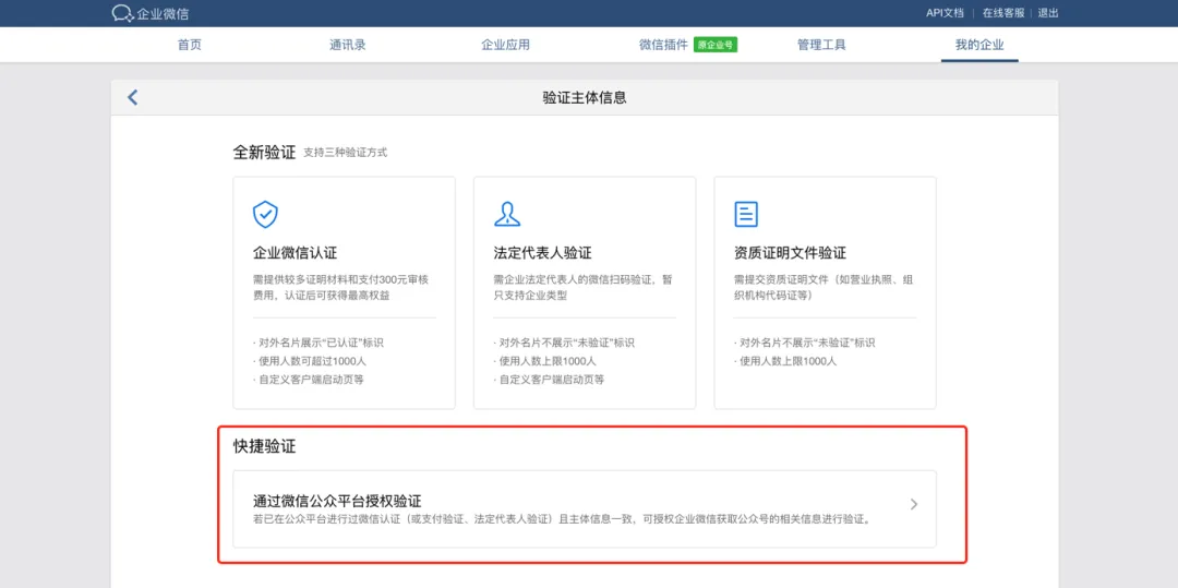 ①公众号授权认证入口:若您的企业/机构已认证过微信公众号,可使用公众号管理员的微信进行授权,将公众号的认证信息授权给企业微信完成认证。