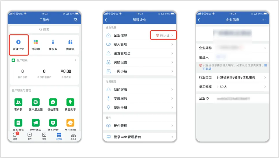 ②手机端授权认证入口:超级管理员进入APP,选择【工作台】->【管理企业】->【企业信息】->【进行认证】